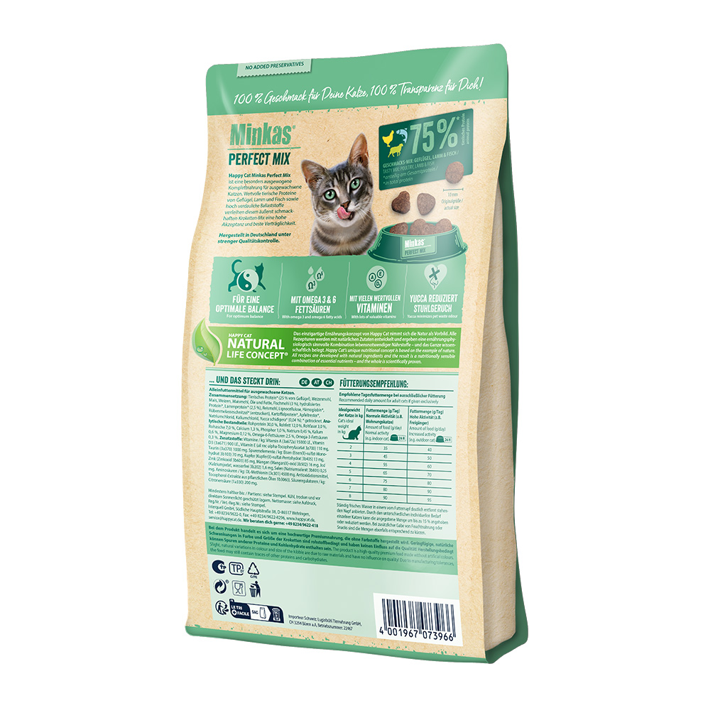 Happy Cat Minkas Perfect Mix is a particularly wellbalanced complete food for adult cats. Valuable animal proteins from poultry, lamb and fish are combined with highly digestible dietary fibre to make a tasty and optimally digestible kibble mix