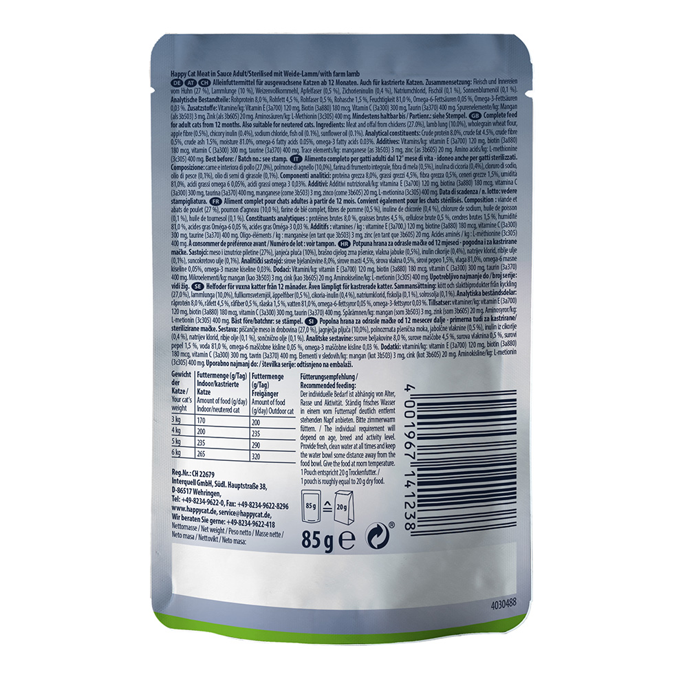 Happy Cat Meat in Sauce with meadow lamb offers total pleasure with its high-quality meat and delicate sauce. This tasty food is especially well tolerated, helps to regulate the digestion and is suitable for neutered cats too.